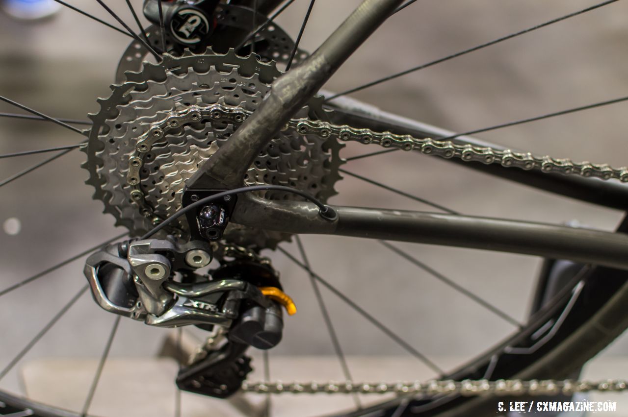 One of the bikes Appleman displayed was one he made for his fiancé as a gravel bike. It was built with TRP Hylex hydraulic brakes with a Di2 adapter kit for shifting an XTR clutch derailleur over an 11-40 M9000 cassette. Up front the chain spins on a Rotor 3D crank with a 40 tooth wide/narrow Wolf Tooth Ring. Continental Speedride 700 X 42 tires were mounted tubeless to HED Ardennes + rims with room to spare in the frame (though the Speedride is known to be narrower than a true 42) and the entire build yielded a hot gravel racer.