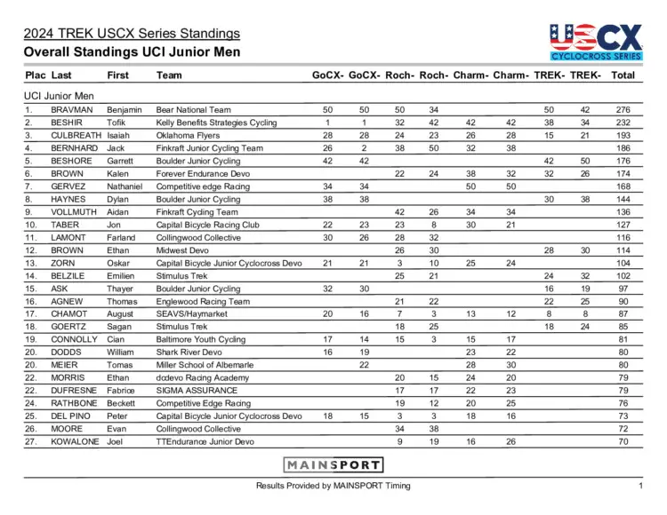 2024 USCX Junior Men Series Results and Standings: SHARE ON: cyclocross magazine — October 16, 2024 Advertisement 2024 USCX Junior Men Series Results and Standings: News Pedal Shootout: The New Wolftooth Components ALT Pedals Clifford Lee, March 23, 2026 news 2026 UCI Cyclocross World Championships Results: Elite Men – Hulst, the Netherlands cyclocross magazine, February 1, 2026 2026 World Championshipslive race coveragenewsPROCXrace reports 2026 UCI Cyclocross World Championships Results: U23 Women – Hulst, the Netherlands cyclocross magazine, February 1, 2026 2026 World Championshipslive race coveragenewsPROCXrace reports 2026 UCI Cyclocross World Championships Results: Junior Men – Hulst, the Netherlands cyclocross magazine, February 1, 2026 2026 World Championshipslive race coveragenewsPROCXrace reports 2026 UCI Cyclocross Results: U23 Men – Hulst, the Netherlands cyclocross magazine, January 31, 2026 2026 World Championshipslive race coveragenewsPROCXrace reports 2026 UCI Cyclocross Results: Junior Women – Hulst, the Netherlands cyclocross magazine, January 31, 2026 2026 World Championshipslive race coveragenewsPROCXrace reports 2026 UCI Cyclocross Results: Elite Women – Hulst, the Netherlands cyclocross magazine, January 31, 2026 2026 World Championshipslive race coveragenewsPROCXrace reports The Rock Cobbler Returns: A Cyclocross-Inspired Gravel Ride cyclocross magazine, January 19, 2026 gravelGravel Racesnews USA’s 2026 Cyclocross World Championship Team Unveiled cyclocross magazine, January 15, 2026 news Nutty Cross Returns to Ruhstaller Brewery with Free First-Timer Racing, Relays, Live Music cyclocross magazine, November 18, 2025 news > More News