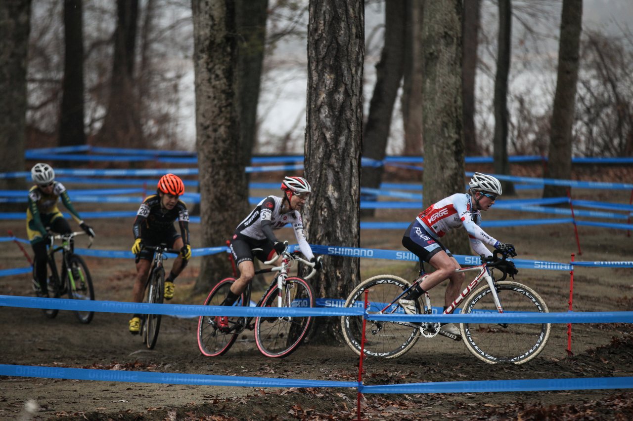 The Elite Men hit the course, and quickly a lead group of select racers formed: Series leader Dan Timmerman (House Industries/SimpleHuman/Richard Sachs), Curtis White (Cannondale p/b Cyclocrossworld.com), Kerry Werner (Optum p/b Kelly Benefit Strategies), and New England fan favorite Anthony Clark (JAM Fund/NCC). Justin Lindine (Redline Factory/NBX) and Christian Favata (TRT Bicycles) chased, but Lindine alone was able to connect with the leaders.