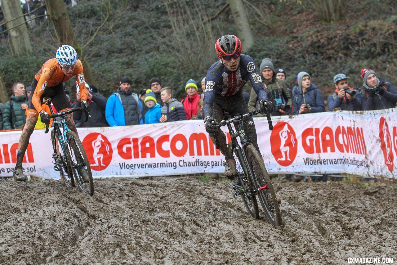 Ben Tulett and Tomas Kopecky battled into the last lap. Junior Men, 2018 UCI Cyclocross World Championships, Valkenburg-Limburg, The Netherlands. © Gavin Gould / Cyclocross Magazine