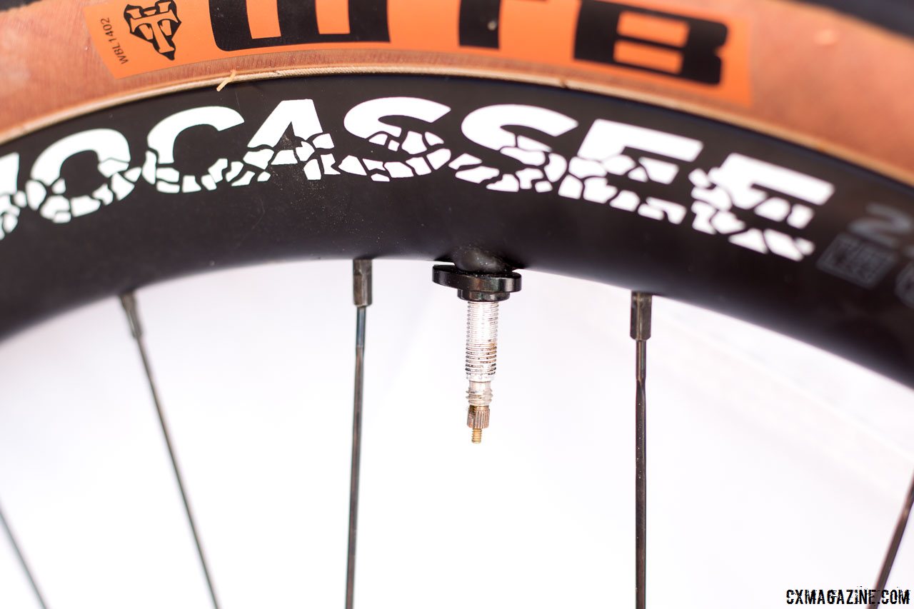 Boyd Cycling’s new Jocassee 650b carbon gravel wheel embraces WTB’s Road Plus movement. Note the Boyd tubeless valve wingnut to make an emergency inner tube installment problem-free. Press Camp 2017. © Cyclocross Magazine