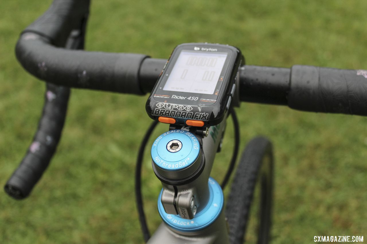A Moots titanium stem holds his Pro Vibe handlebar and Bryton Rider 450 bike computer.