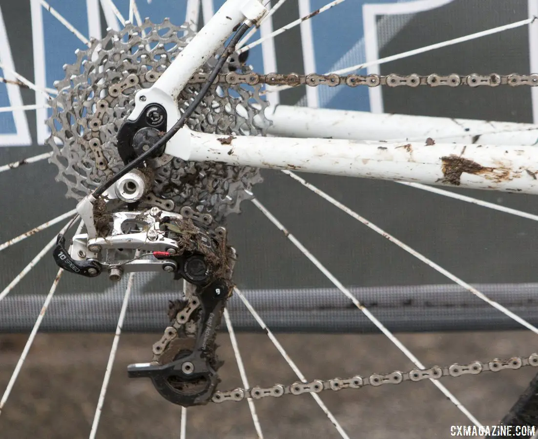SRAM’s X0 rear mountain clutch rear derailleur and 11-36 10-speed cassette helped Carden King up the hills and kept his chain on. . © Cyclocross Magazine