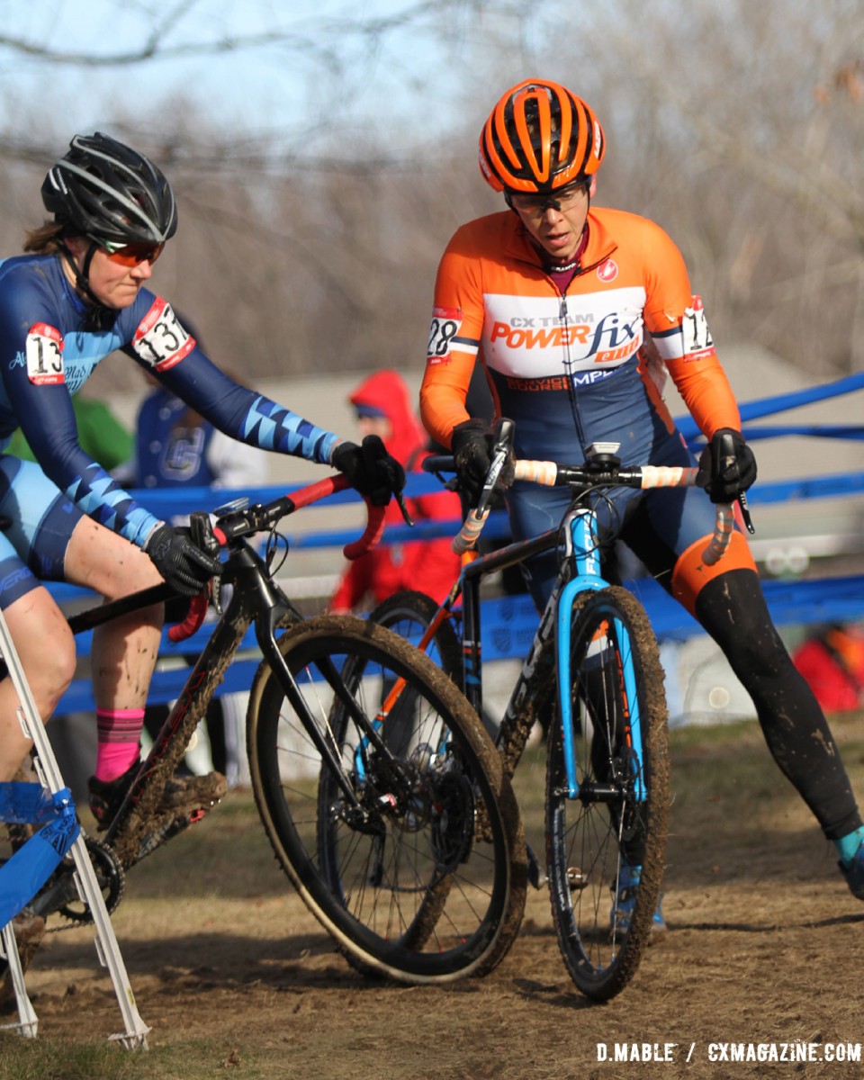 Jauron Vetter and Rebecca Ireland clash in a tight corner during the Women’s 40-44 championship race on Thursday in Hartford. 2017 Cyclocross National Championships. ©D. Mable/Cyclocross Magazine