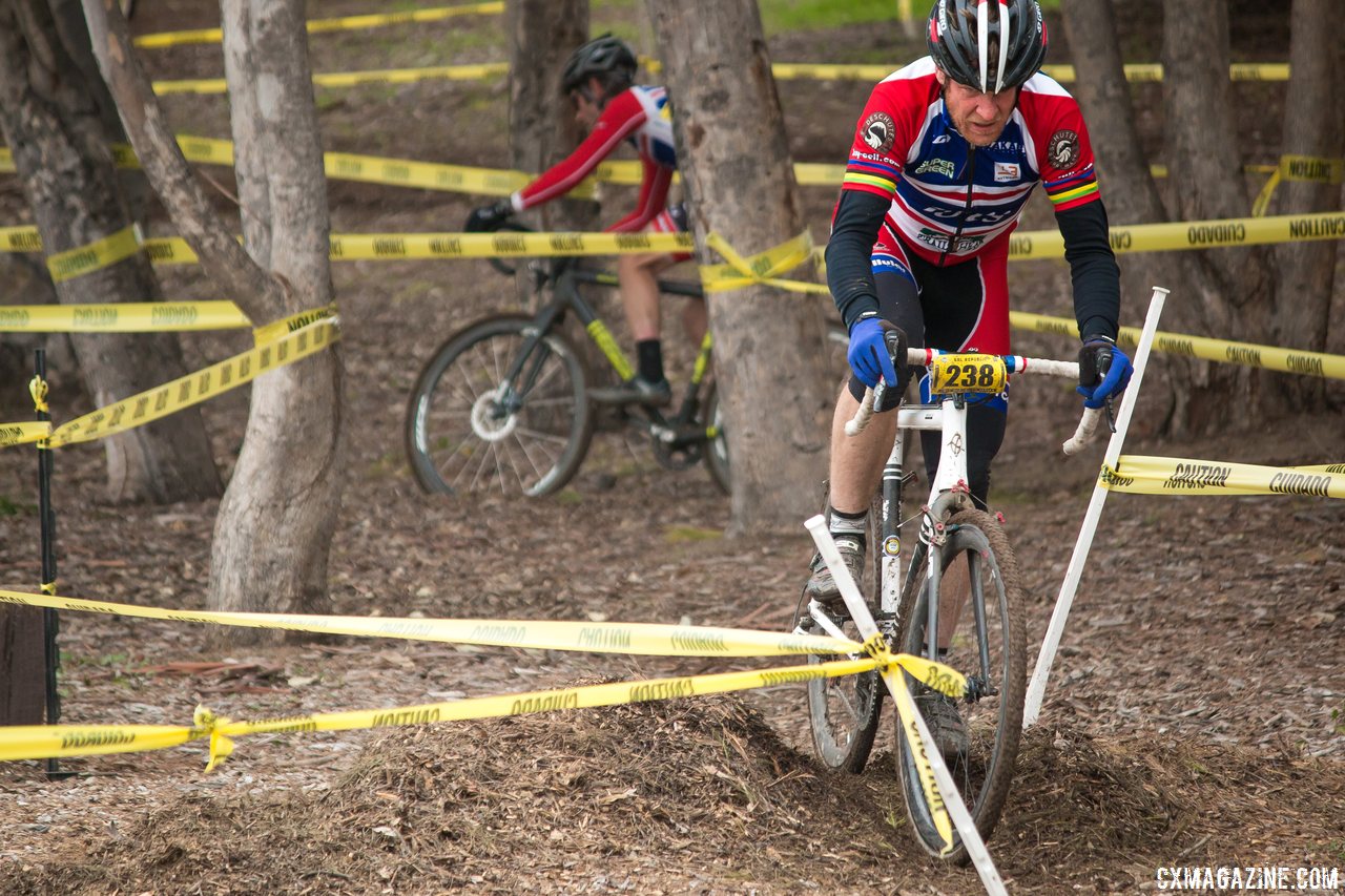 Don Myrah leads teammate Brock Dickie through the trees at the Lake Cunningham SuperPro San Jose race. January 17, 2015. © Cyclocross Magazine