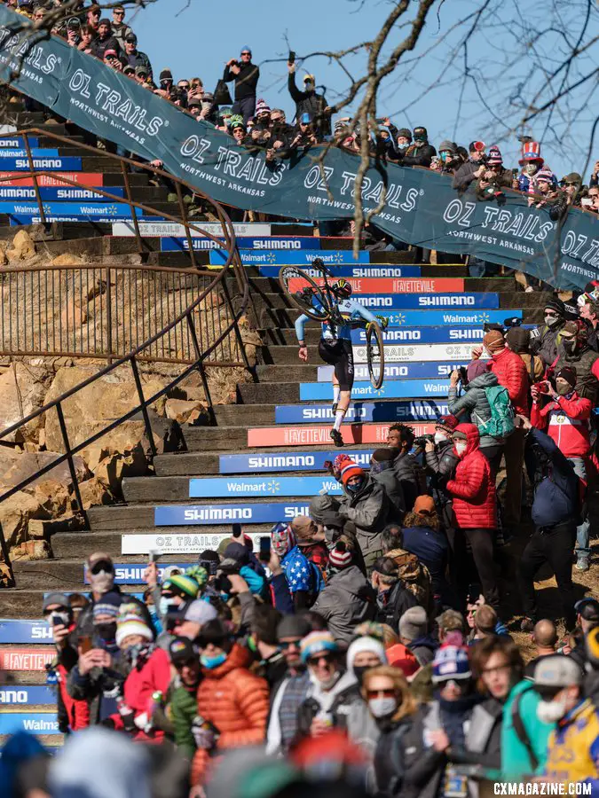 Joran Wysure all alone on the stairs. U23 Men, 2022 Cyclocross World Championships, Fayetteville, Arkansas USA. © G. Gould / Cyclocross Magazine