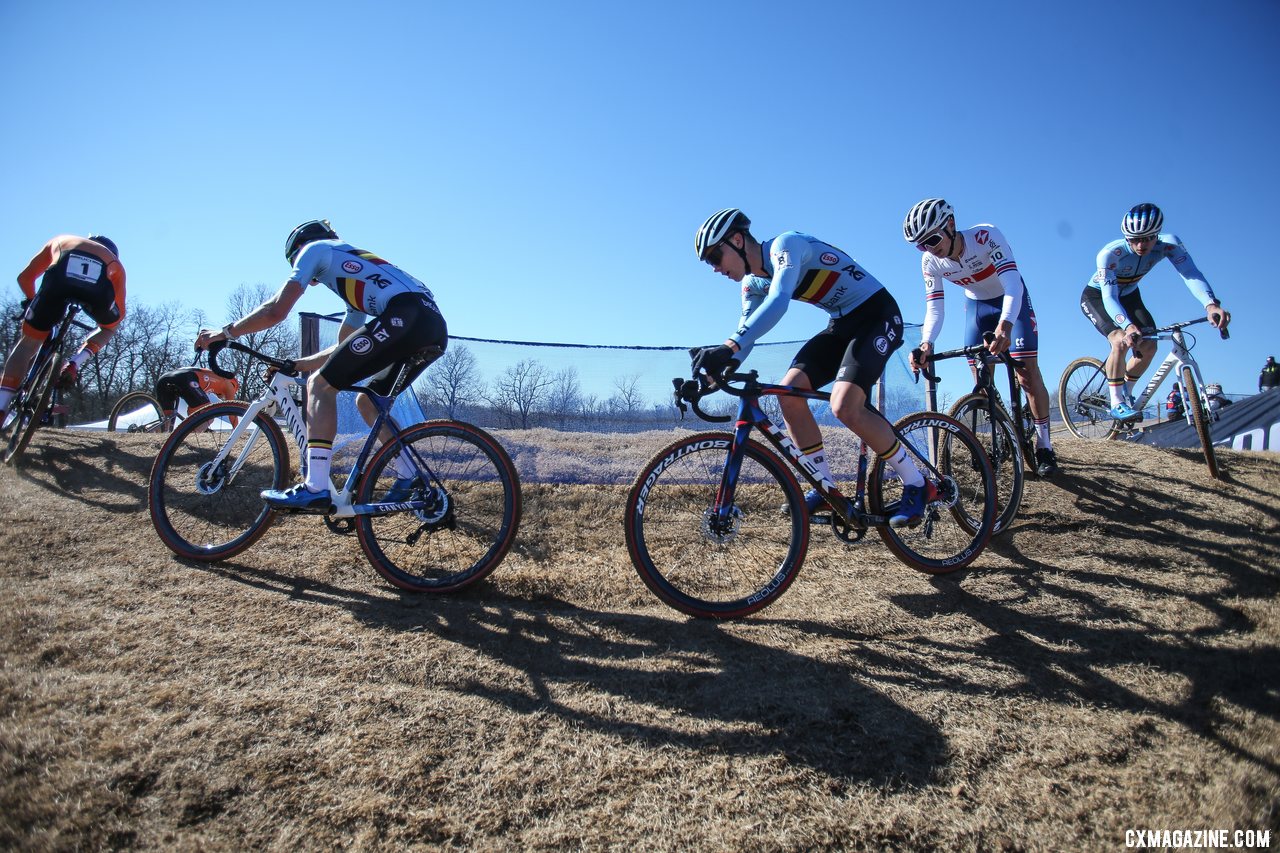 Traffic jam at the turn. 2022 Cyclocross World Championships, Fayetteville, Arkansas USA. © J. Corcoran / Cyclocross Magazine
