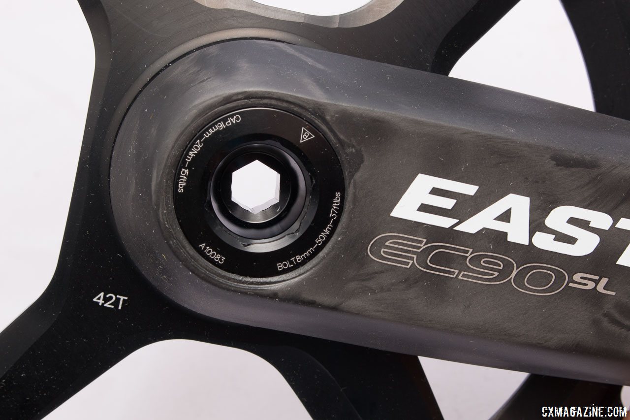 Easton's new EC90 SL carbon crankset utilizes a hand-adjustable bearing preload dial that's locked into place with a 2mm Allen key. © Cyclocross Magazine