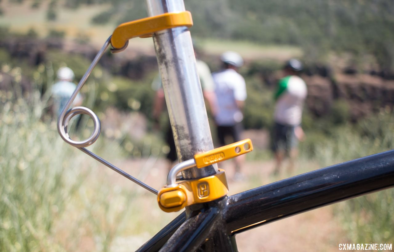You don't have to be completely blue with envy, however, as the featured Paul Component Engineering parts are now available and can await your frame. The Falconer Cycles drop bar mountain bike, as with most demo bikes at the Paul Camp, was fully dressed with domestically-built componentry, including plenty of Paul Component Engineering bits in blue (this year's special anodized color). The Falconer used the Tall and Handsome seatpost, Quick Release Seat Post Collar, Stem Top Cap Light Mount, Boxcar stem, Klamper mechanical disc brakes, and Thru Axles Quick Releases.