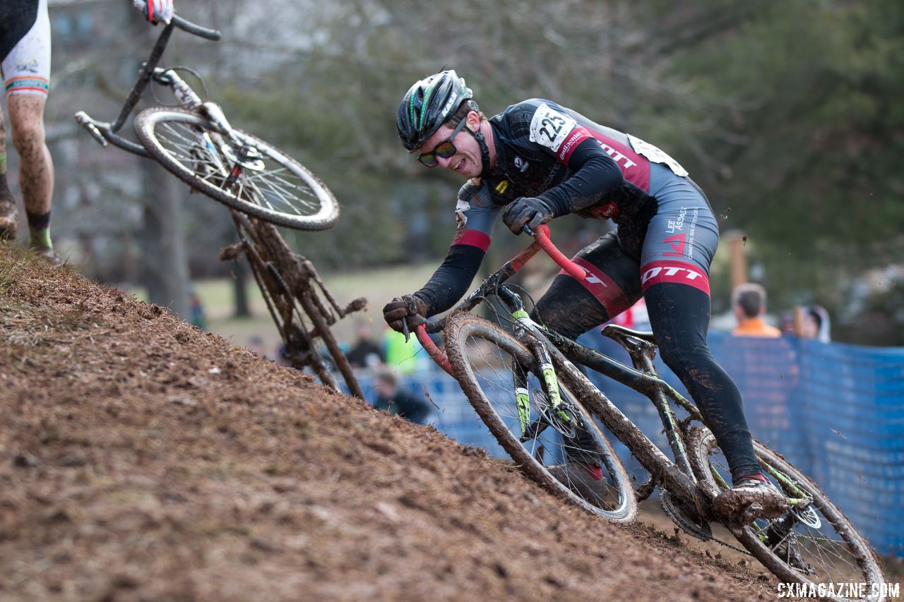 While Stephenson was charging hard—bringing Hecht within a few seconds—Hecht's gap was insurmountable and Hecht was able to roll across the finish line solo for his fifth cyclocross National Championship.