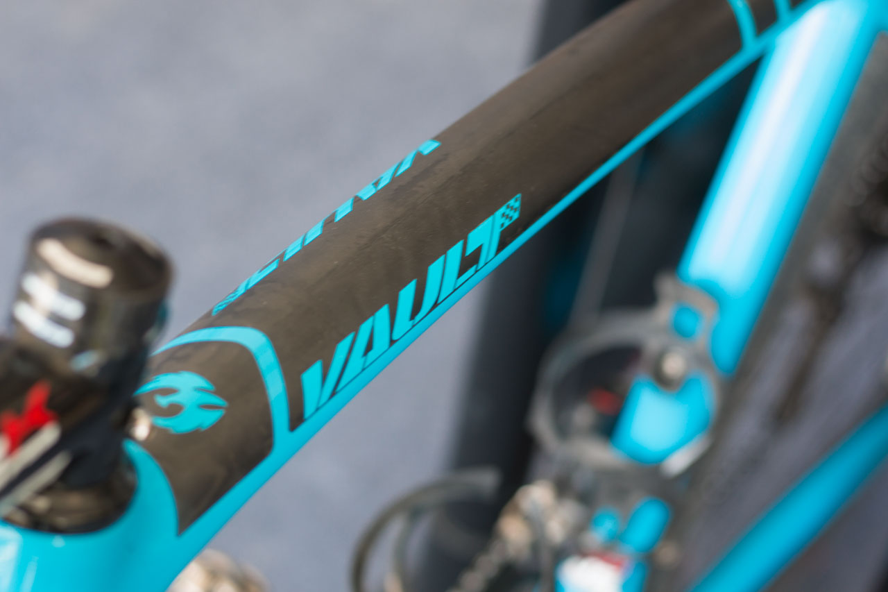 Haidet stopped his bike with K-Force WE hydraulic flat mount calipers, which are not yet available to the public but coming soon. FSA mounting plates adapted the calipers for the Vault frame, and Haidet's rotors were a 160mm, 6-bolt model.