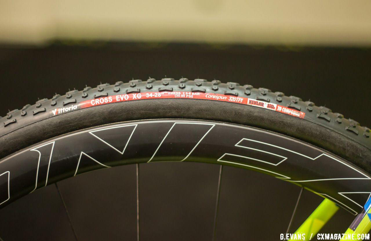 The Garneau carbon fork has internal cable routing, a 12mm thru axle and plenty of fender and mud clearance. The seatstay bridge also features an integrated fender eyelet. The Steeple XC has Easton EC90 SL wheels wrapped with 700x33c Vittoria Cross Evo XG tires.