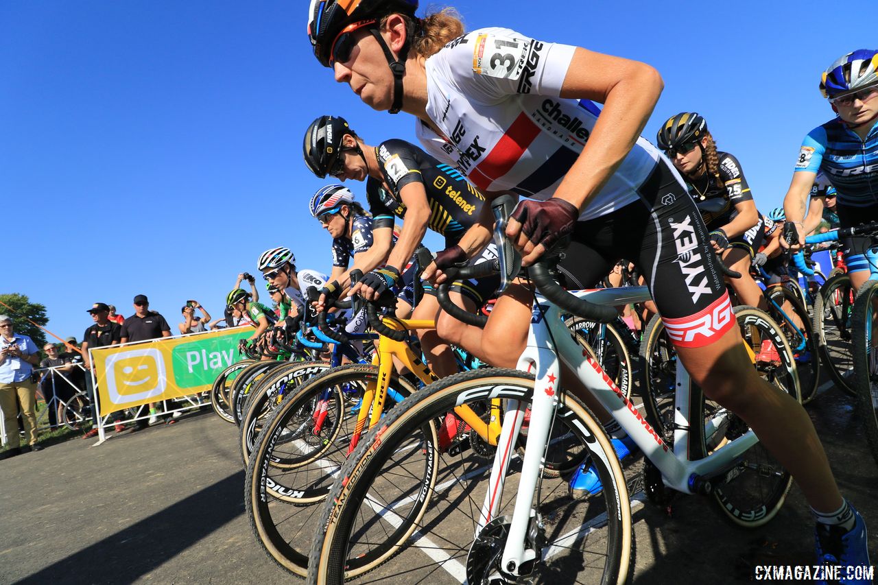 The women rip through the holeshot in the marquee time slot in Waterloo. 2018 World Cup Waterloo. © R. Clark / Cyclocross Magazine