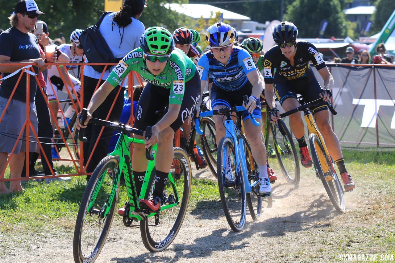 As she descended toward the pavement at the bottom of the Segafredo Run-Up, it appeared that Noble's efforts might have started to break Vos on the warm September afternoon. She carried a small gap into the Run-Up and exited with a several-bike-length lead. Vos, however, recovered, and by the mid point of the bell lap, Vos was back on Noble's wheel.