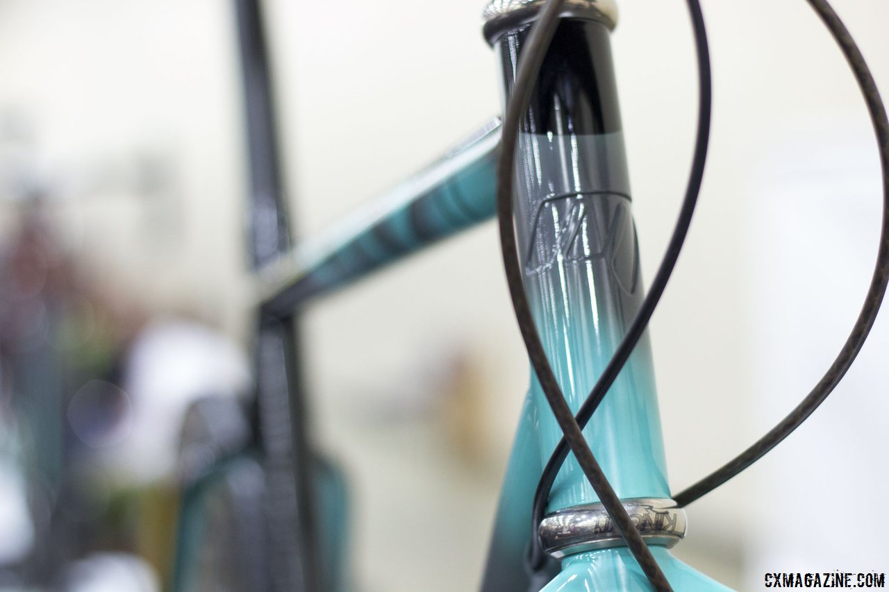 Sussman, who races cyclocross himself, showed off a mint green stainless steel/Columbus chromoly cyclocross frame and fork at NAHBS 2015, with a stainless steel down tube, head tube and fork legs, and Columbus Max top tube and Zona seat stays.