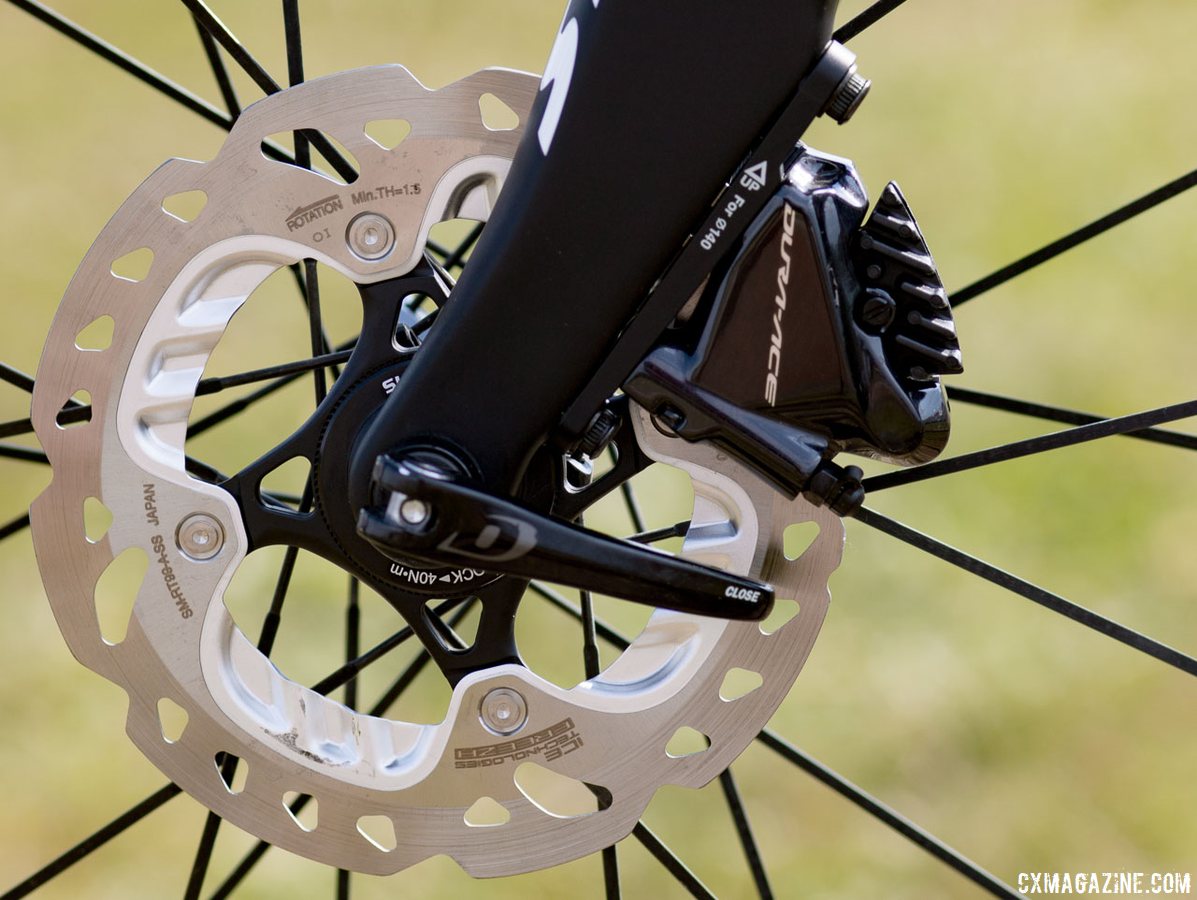 The brake levers and hydraulic disc brakes are also from the new Dura-Ace Di2 product line. The brake levers are Dura-Ace dual control levers with 2x11-speed shifting and the brakes are flat-mount with Ice Tech rotors.