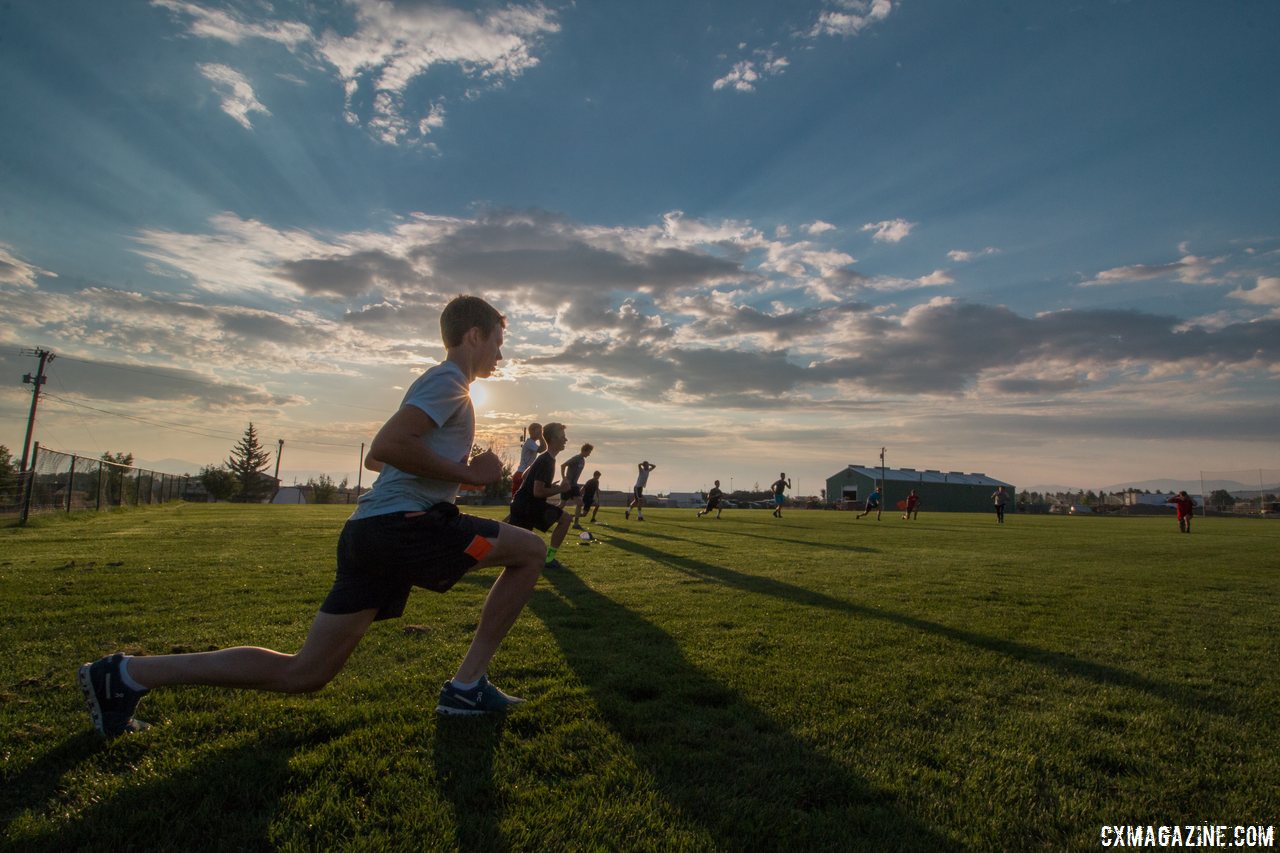 After a cross country run warm-up, the campers ready for sprints, leg swings and hip openers. 2017 Montana Cross Camp © Cyclocross Magazine