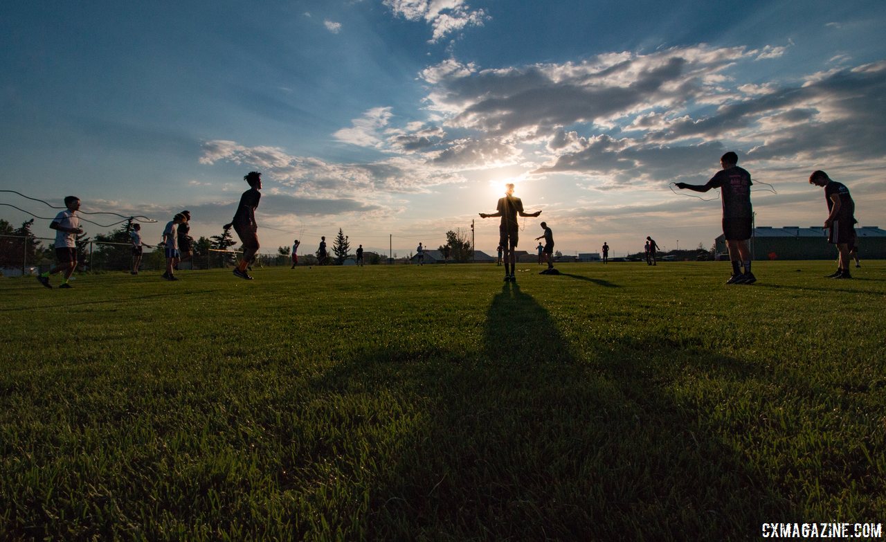 After a cross country run warm-up, the campers ready for sprints, leg swings and hip openers. 2017 Montana Cross Camp © Cyclocross Magazine