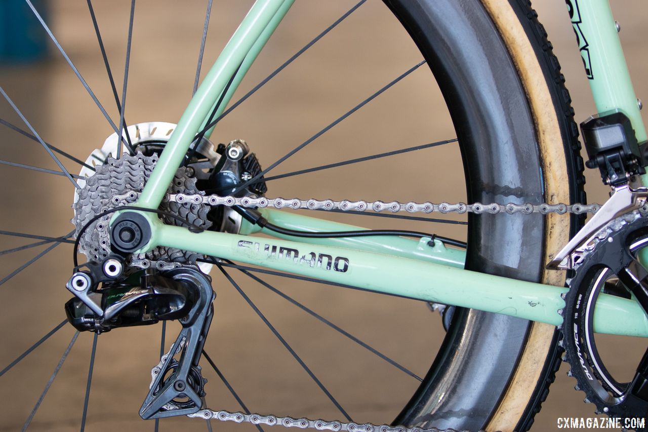 Andrew Juiliano relies on the non-clutch Dura-Ace Di2 rear derailleur, and switches between Shimano C60 and C40 tubulars. Rock Lobster team cyclocross bike. 2019 NAHBS Sacramento. © A. Yee / Cyclocross Magazine