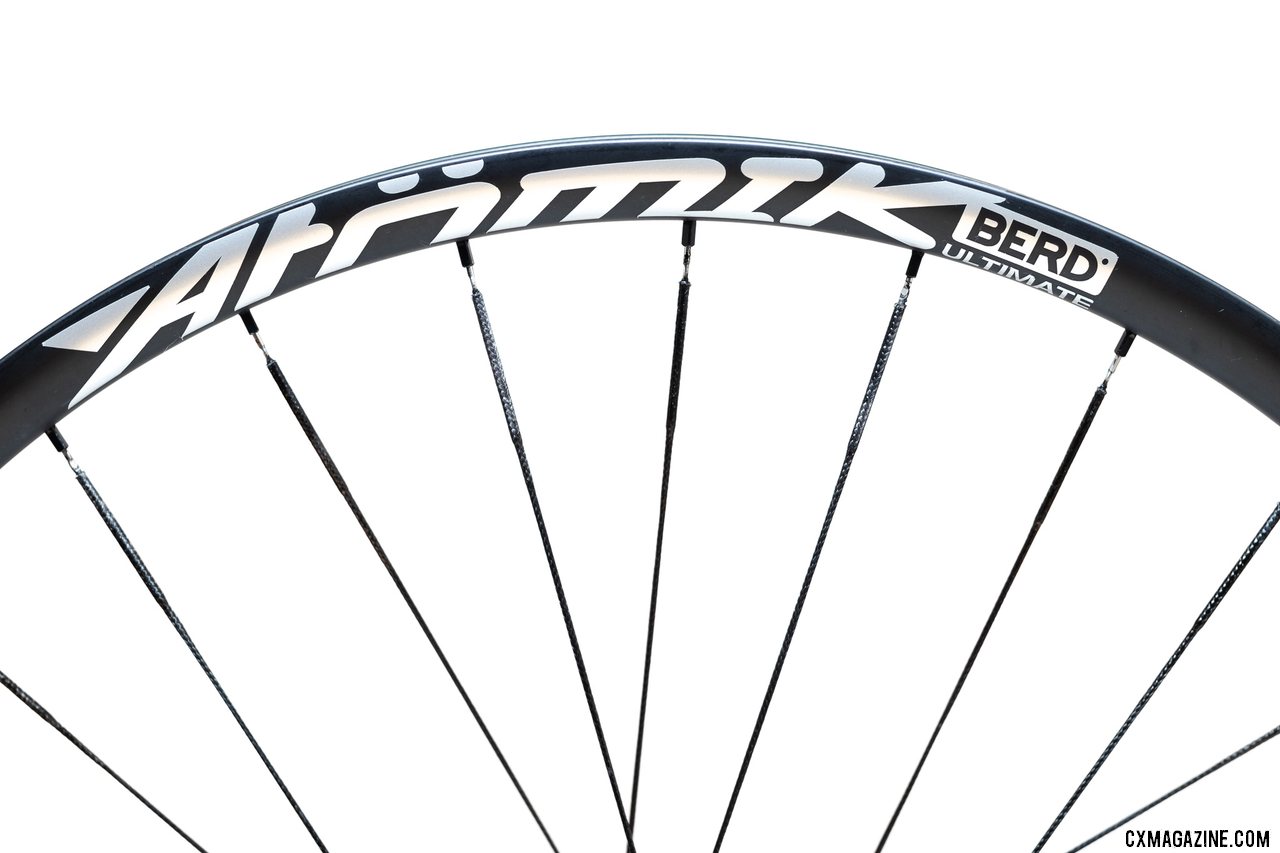 Atomik's rim uses a hookless sidewall design, with a wide bead shelf. Atomik's Ultimate Berd carbon tubeless wheels with Berd polyethylene spokes. © Cyclocross Magazine