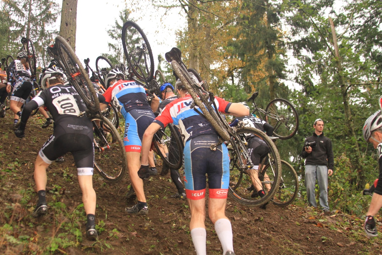 The Seattle Cyclocross Series took to the King County Fairgrounds in Enumclaw, WA on Sunday for the fifth installment of the series. Continuous precipitation all week long had the ground saturated and ripe for creating some slippery cross conditions on a classic, Belgian-style course. A short 50 meter starting straight lead into a right hand turn which created problems all day long as racers hit it with some speed and the greasy conditions lead to numerous crashes. From there races wound through a series of 180 degree turns before being shot out towards a steep, nasty run up.