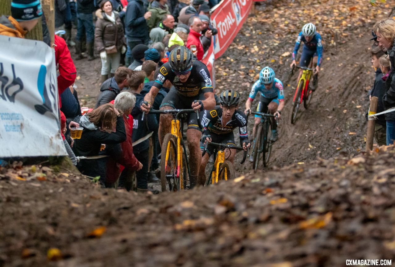 Sanne Cant, Fleur Nagengast and Annemarie Worst race to the first hairpin. 2018 Superprestige Gavere Women. © A. Yee / Cyclocross Magazine