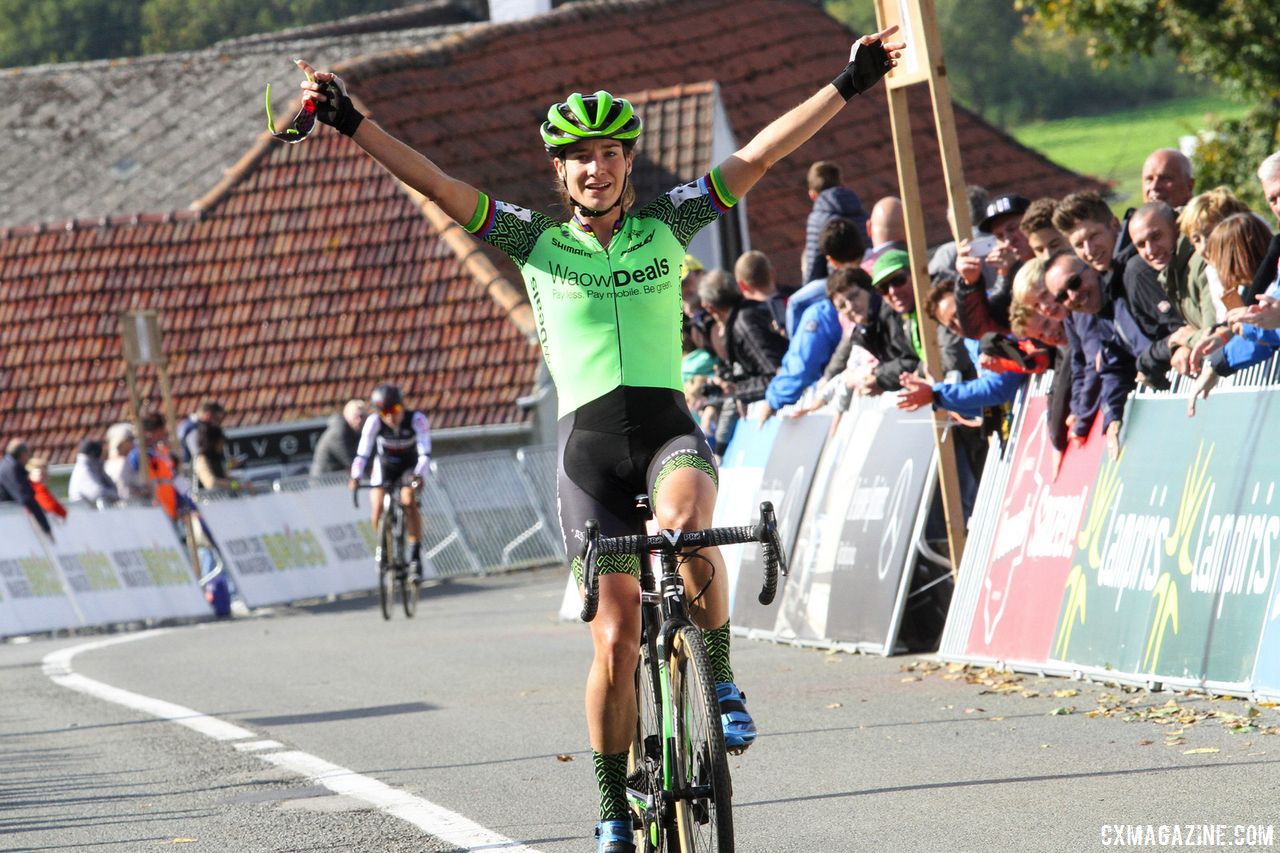 Marianne Vos celebrates her win in Ronse. 2018 Brico Cross Ronse / Hotondcross. © B. Hazen / Cyclocross Magazine