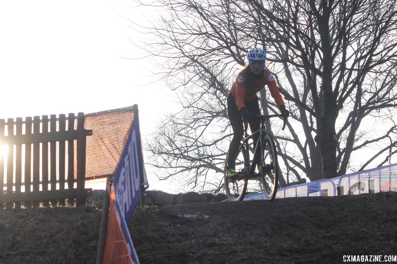 A silhoutted Denise Betsema gets set for a descent. 2019 Bogense World Championships Course Inspection, Friday Morning. © Z. Schuster / Cyclocross Magazine