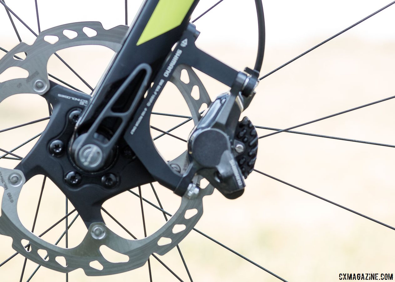 Post mount adapters are required to attach the BR-R785 calipers to Fahringer's flat mount frame. Rebecca Fahringer's Scott Addict CX with tubeless Maxxis tires. © Cyclocross Magazine