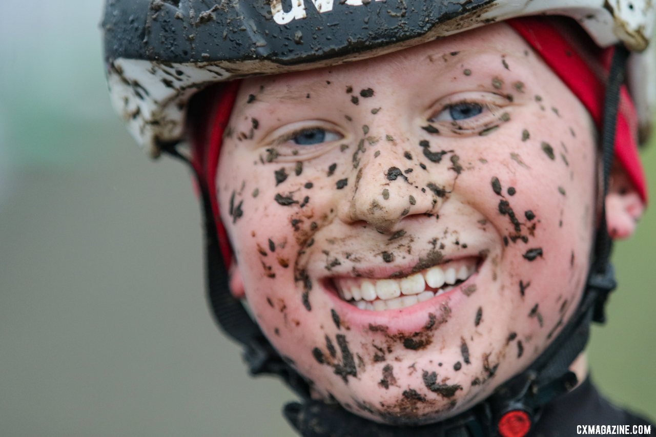 Kian Reid is all smiles after taking the silver in a muddy race. Junior Men 11-12. 2019 Cyclocross National Championships, Lakewood, WA. © D. Mable / Cyclocross Magazine