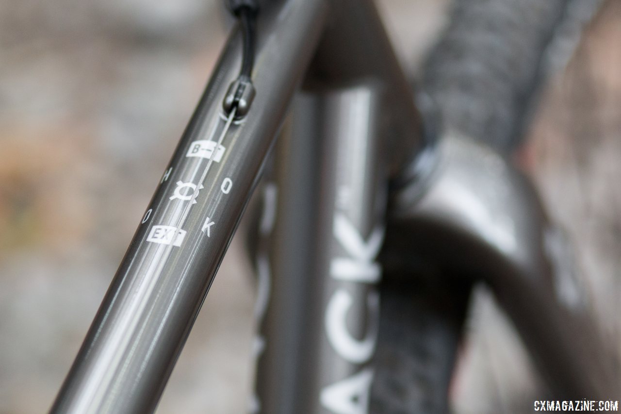 Bombtrack Hook EXT cyclocross/gravel/adventure bike routes the rear shift cable along the top tube, and the rear brake hose under the down tube. © Cyclocross Magazine