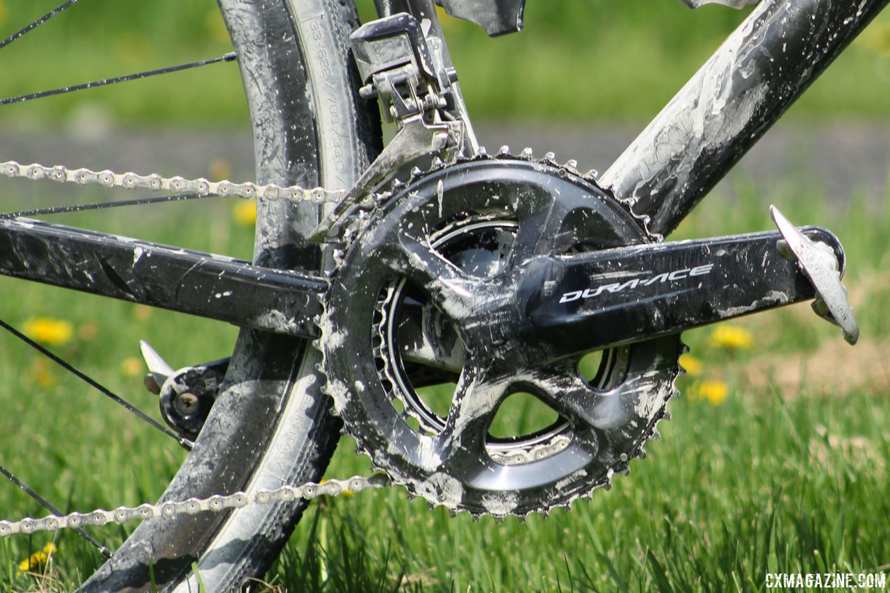 The crankset was a Dura-Ace R9100 with compact-style 50/34t chain rings. The front derailleur was a Dura-Ace R9150 Di2 model. Almanzo 100 Allied Alfa Allroad. © Cyclocross Magazine