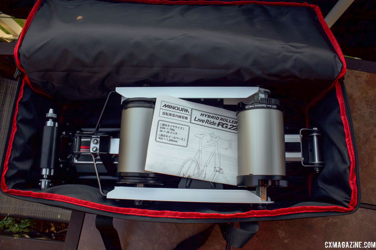 Unzipping the carrying bag reveals a neat package with a much more travel-friendly form factor than a traditional trainer. Minoura Live Ride FG 220 Hybrid Roller portable trainer. © B. Grant / Cyclocross Magazine