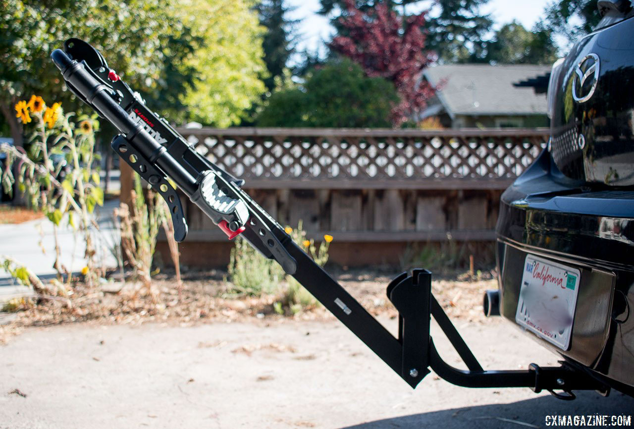 You fold the carry arm up and down using these two red levers. Allen Sports S535 Premier 3-bike hitch rack. © Cyclocross Magazine