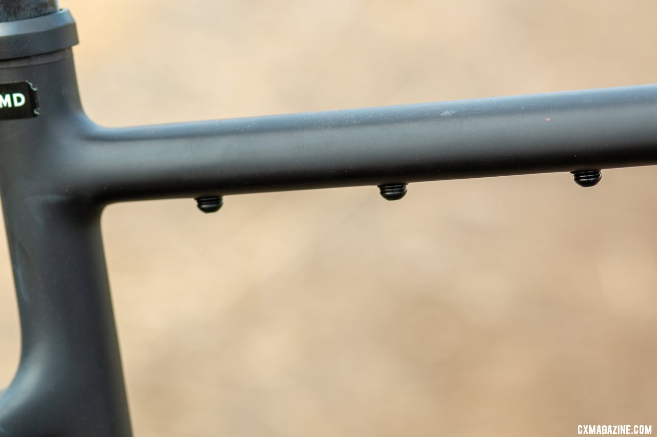The frame and fork have an ample offering of mounting barnacles, should you decide you need more carrying capacity than just two bottles. There are mounting bolts on each fork leg, the top of the top tube, and the underside of the top tube. You’ll feel a few of these bolts should you try shouldering the bike. Need a wet weather steed? There’s a removable fender mount between the seatstays, a bolt behind the bottom bracket, and two hidden bolts inside the seat stays to help you mount such rain protection.
