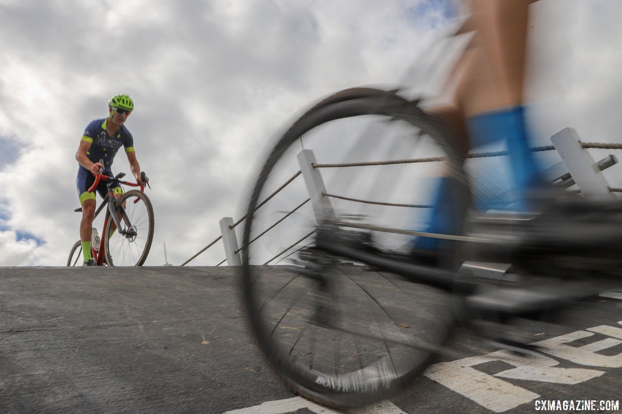 The steep barn flyover can be a little daunting on the other side. 2018 Trek CX Cup, Waterloo © Cyclocross Magazine / R. Clark