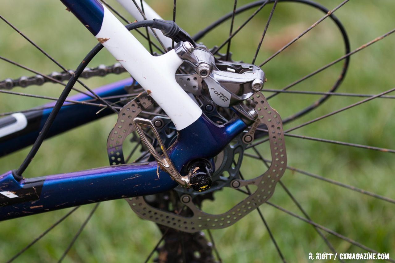 The purported benefit of the system are stiffness gains resulting in added control and eliminating chainline issues that can result from running thru axle systems on disc brake bikes. It does mean, for now at least, a limitation in wheel options, short of a conversion kit from Next Wheels. Gomez Villafañe doesn't yet have that worry as his frameset is a 2015 model with quick release dropouts, an option we saw many racers go with in Asheville.