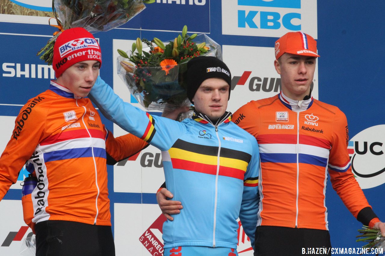 Michael Vanthourenhout, Mathieu van der Poel and Wout Van Aert took turns at the front of the chase group, but they were more playing off each other rather than hunting down Sweeck, who would eventually go on and take his first World Cup win. World Cup U23 series leader Van Aert would follow behind 24 seconds later, and Van der Poel finished third over a half-minute behind second.